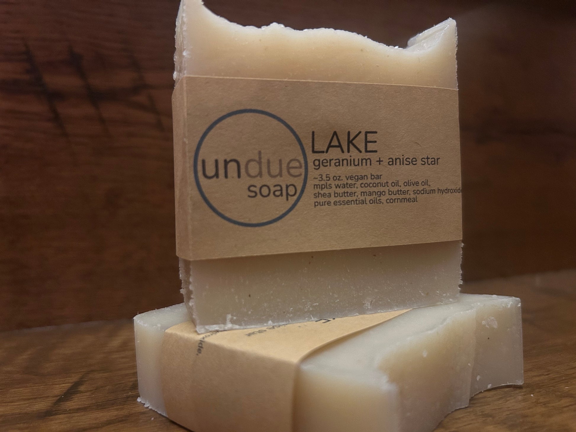 made with: mpls water, coconut oil, olive oil, shea butter, mango butter, sodium hydroxide, pure essential oils, cornmeal