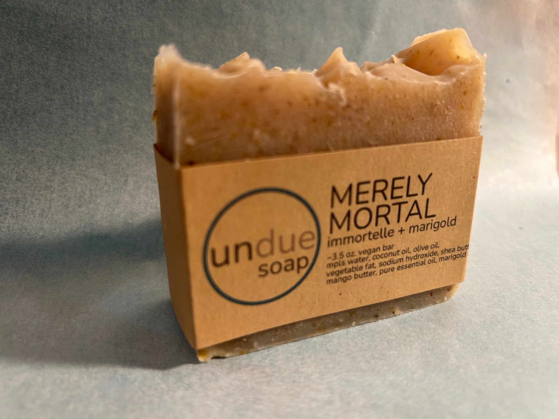 made with: mpls water, coconut oil, olive oil, sodium hydroxide, mango butter, shea butter, pure essential oil, marigold leaf
