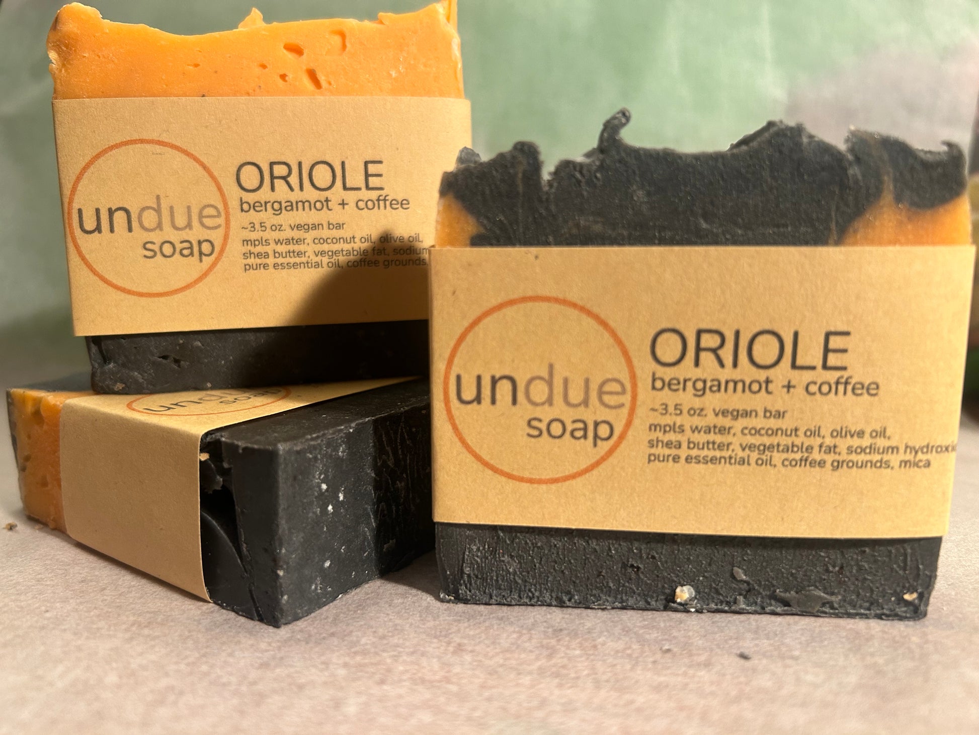 made with: mpls water, coconut oil, olive oil, shea butter, sodium hydroxide, pure essential oil, coffee grounds, mica
